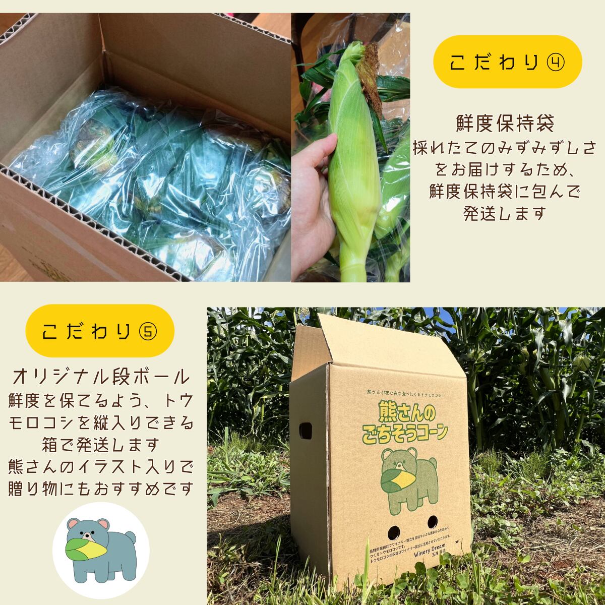 (5)オリジナル段ボール:鮮度を保てるよう、トウモロコシを縦入りできる箱で発送します。熊さんのイラスト入りで贈り物にもおすすめです。